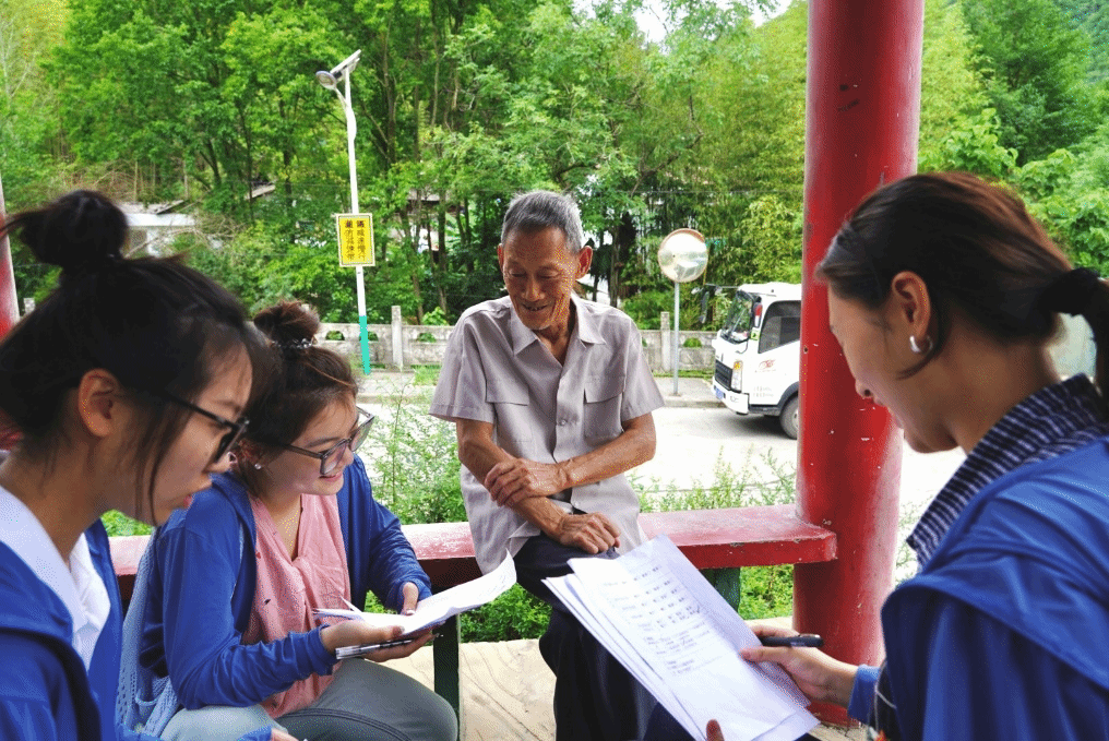 图为队员们在村广场对高爷爷进行普通话调研