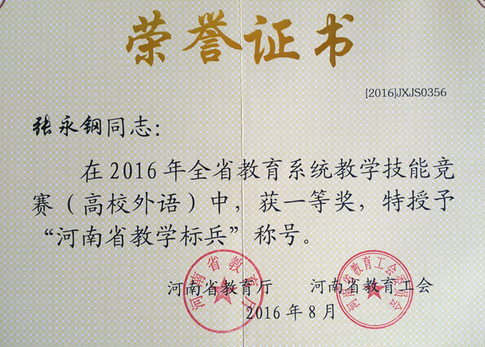 近日,从河南省教育厅、河南省教育工会传来喜讯,在河南省教育系统2016年度教学技能竞赛中,萝莉岛app 张永钢老师喜获一等奖,被授予“河南省教学标兵”光荣称号(全校共有10名教师获得此荣)。