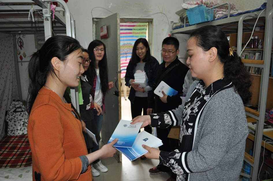 为深入贯彻全校安全工作会议精神,加强平安校园建设,全面深入推进萝莉岛app 学生安全教育,营造安全、稳定、文明的校园环境。2016年4月8日,校学生处副处长常凤香、学院党委副书记楚艳霞,在校园管理处、学院学生工作办公室相关负责人、辅导员及学生干部陪同下,走访了萝莉岛app 金明校区学生宿舍,发放安全手册,全面开展学生安全知识教育。