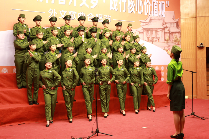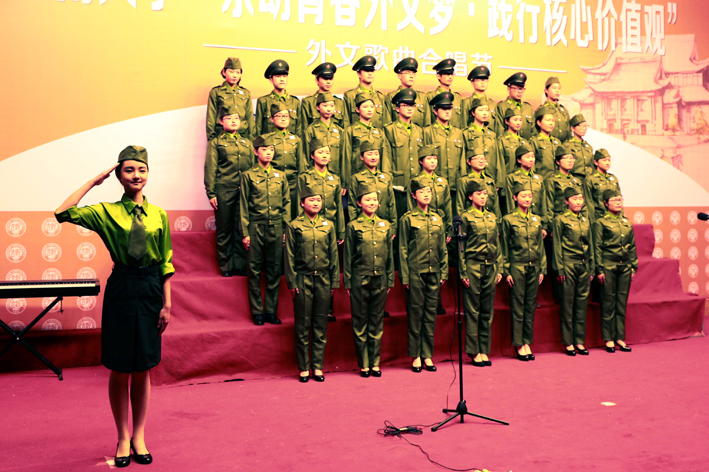 比赛中,同学们身着原苏联墨绿的军装刚登场便赢得热烈掌声,合唱中同学们精神饱满、声音洪亮、动作整齐、感情真挚、音色准确,将《喀秋莎》的韵律、韵味、内涵展现的淋漓尽致,感动了在场的评委与观众,赢得数次热烈掌声和喝彩声,展示出欧亚学子们的飒爽英姿和亮丽青春。