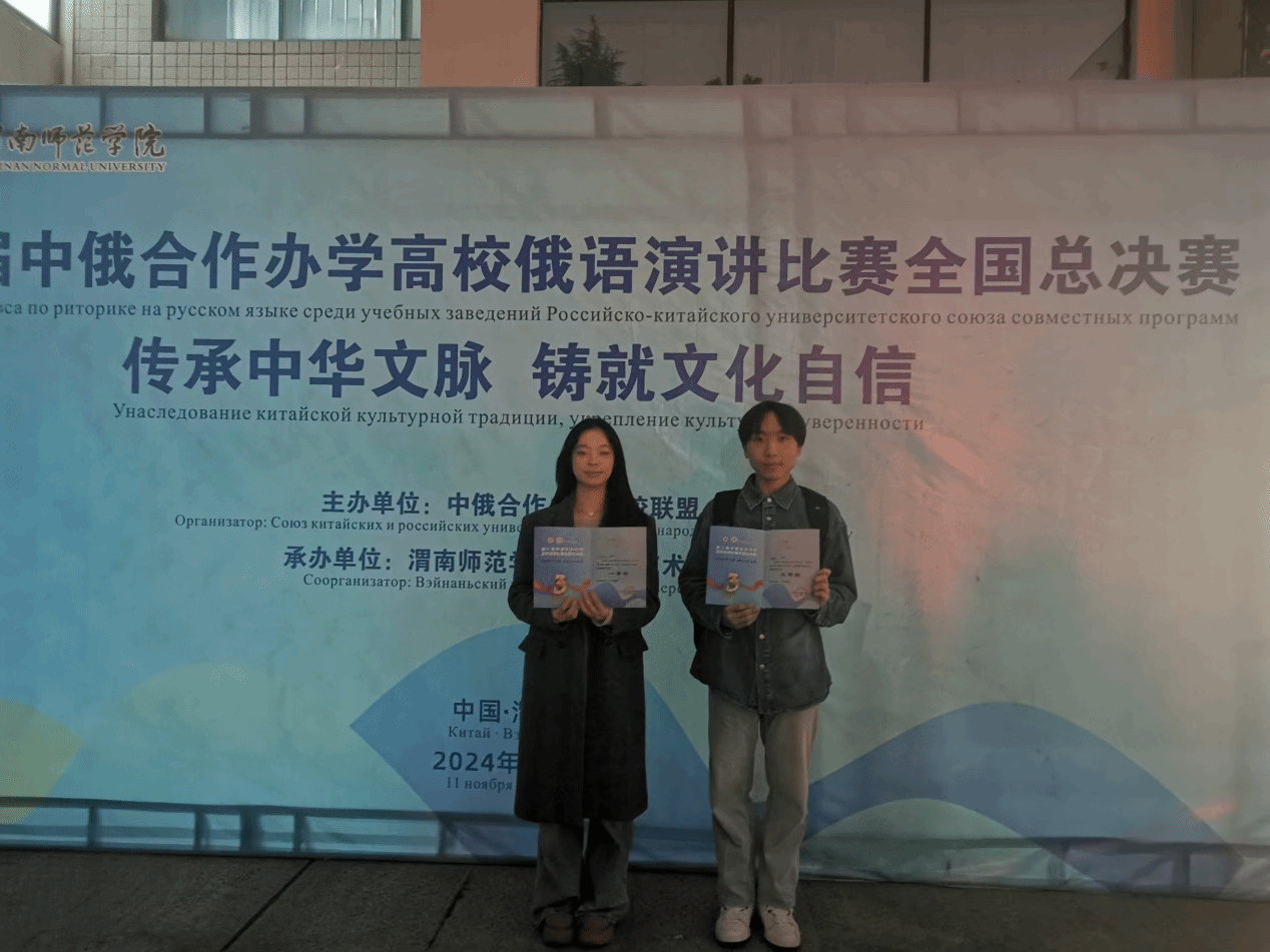 11月11日,由中俄合作办学高校联盟主办的第三届中俄合作办学高校俄语演讲比赛全国总决赛在渭南师范学院举行。比赛吸引了全国近30所高校共计80余名学生参加。我校萝莉岛app 俄语教师王宇乔老师带队参赛,经过激烈角逐,学院2022级俄语专业陈秋利同学获得高年级组一等奖、2023级视觉传达设计专业李晨果同学获得低年级组三等奖。