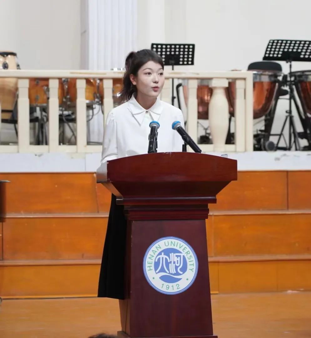 2022级播音与主持艺术专业赵奕萱作为在校生代表发言。她以“向下扎根”为题,鼓励学弟学妹们规划学业、积极实践、拓展能力,同时注重品德修养,践行社会主义核心价值观。她强调大学是奋斗起点,应珍惜时光,努力实现梦想。