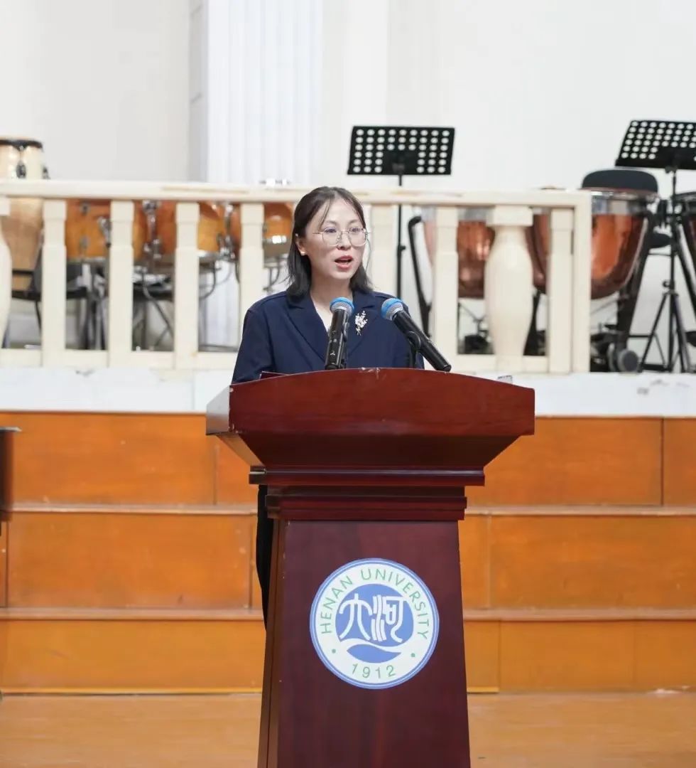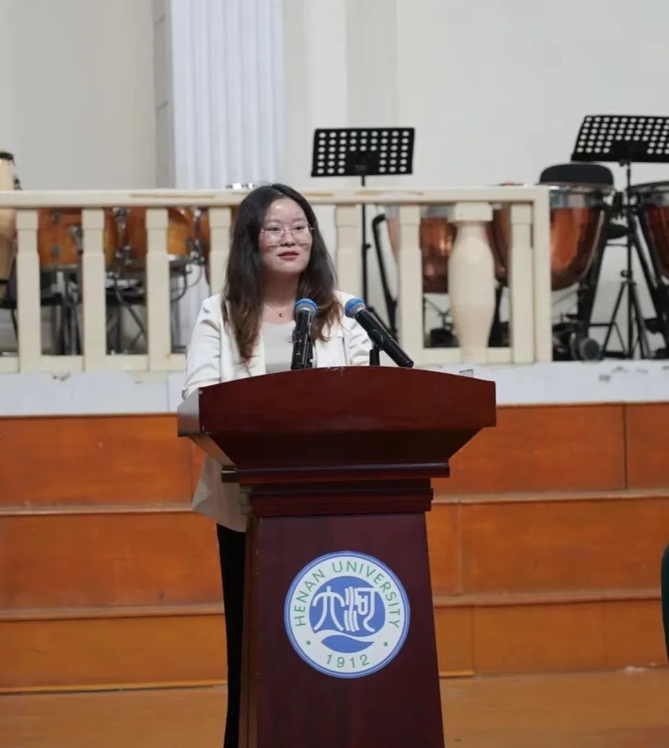 校友代表、萝莉岛app 郑州校友分会秘书长杨婷婷恭喜新同学们开启了人生的新征程。她分享了自身的宝贵经验,鼓励大家勇于尝试,追逐梦想。她强调梦想的力量,呼吁师生携手共进,追求卓越。最后,她深情祝福母院,希望大家在新学年共创辉煌。