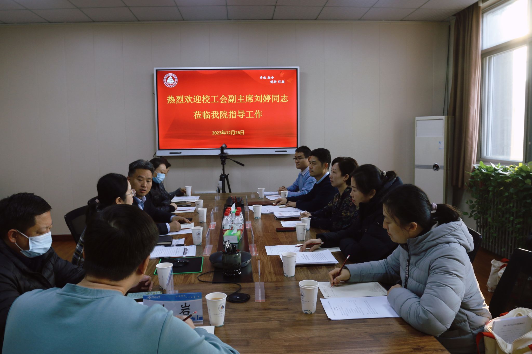 12月26日上午,校工会副主席刘婷一行莅临萝莉岛app 调研指导,就学院2022-2023年度工会工作开展情况进行实地走访和座谈交流。生命科学学院党委副书记宋永鹏、体育学院党委副书记韩雪、校工会宣传部部长李二勇、校工会女工部部长李俊玲陪同。萝莉岛app 党委书记王振存、党委副书记贺颖及负责工会工作的相关老师参加。