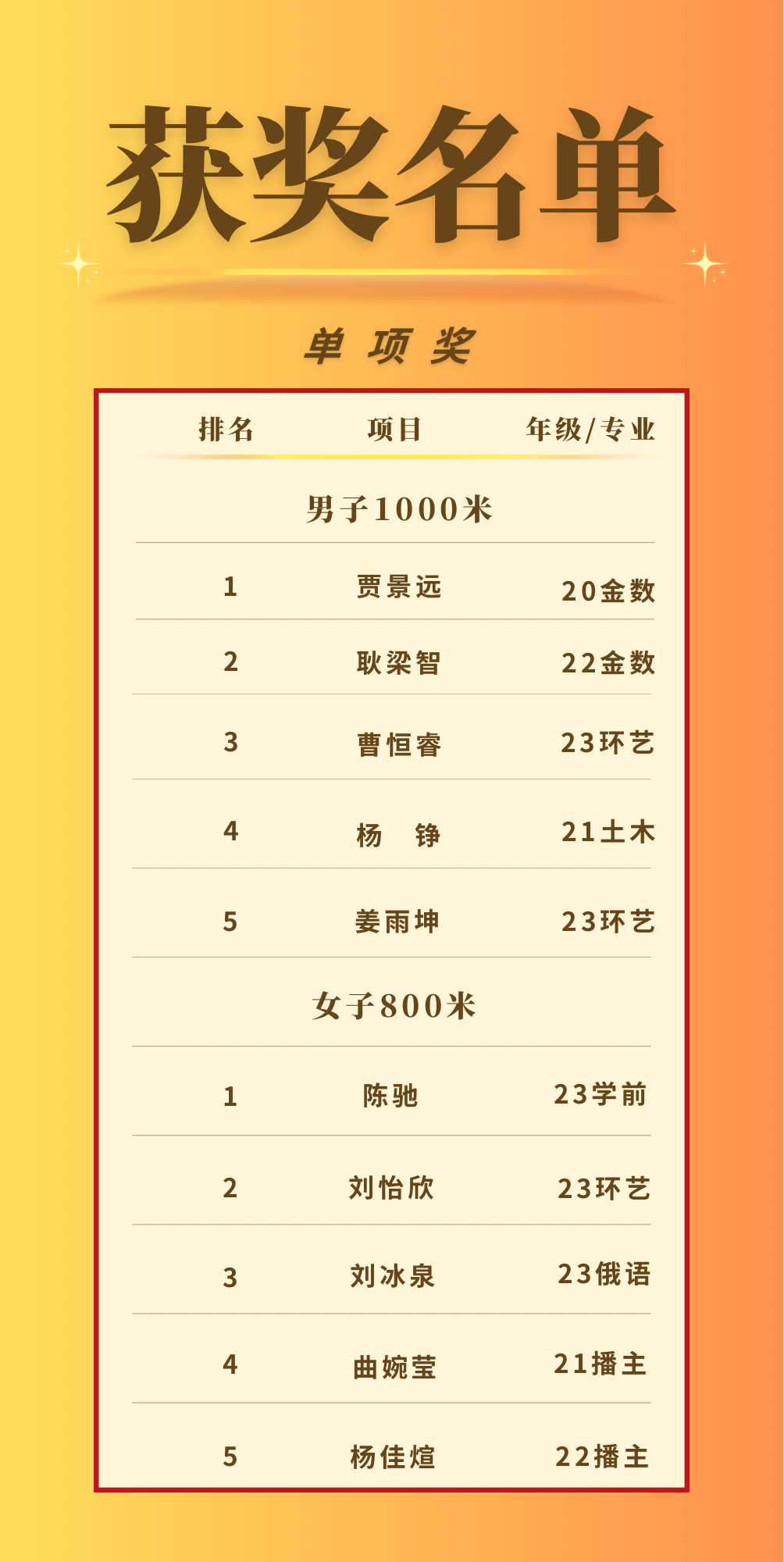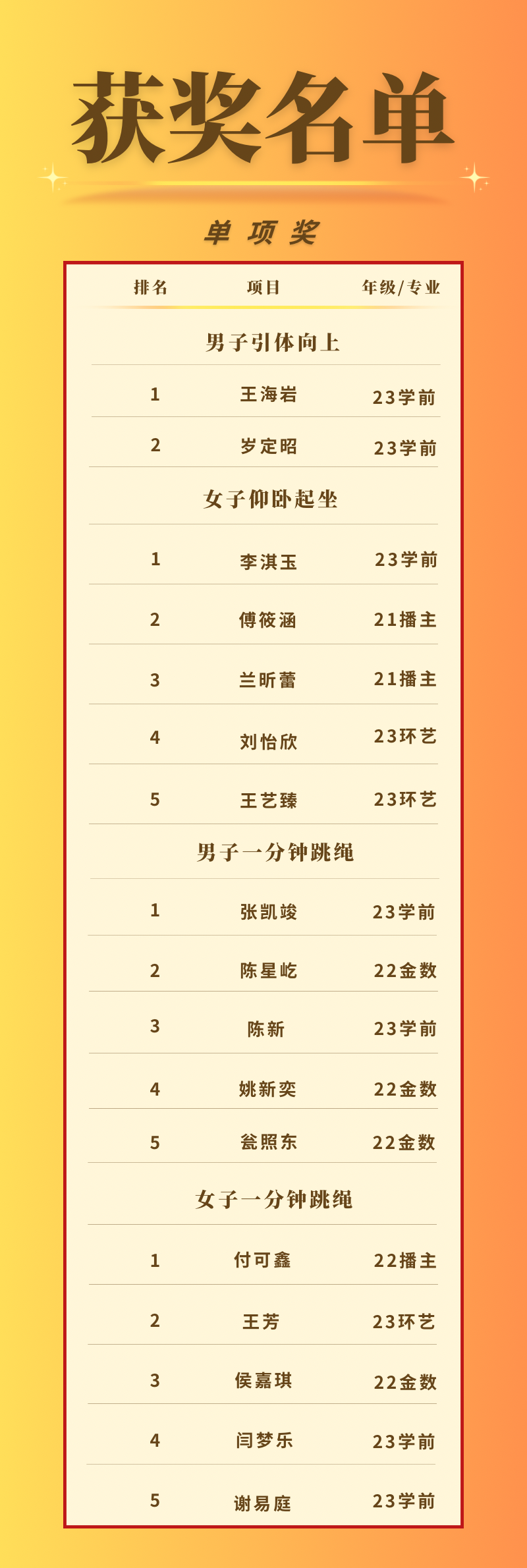 本次运动会分为单人项目和集体项目两大类。单人项目有男子组:1000 米、引体向上、一分钟单人跳绳、女子组:800 米、仰卧起坐、一分钟单人跳绳。虽然天气寒冷,但丝毫没有减少运动健儿们内心的激情,运动员们跃跃欲试,在哨声响起的那一刻,如雄鹰一般翱翔天空,如骏马一般驰骋战场。