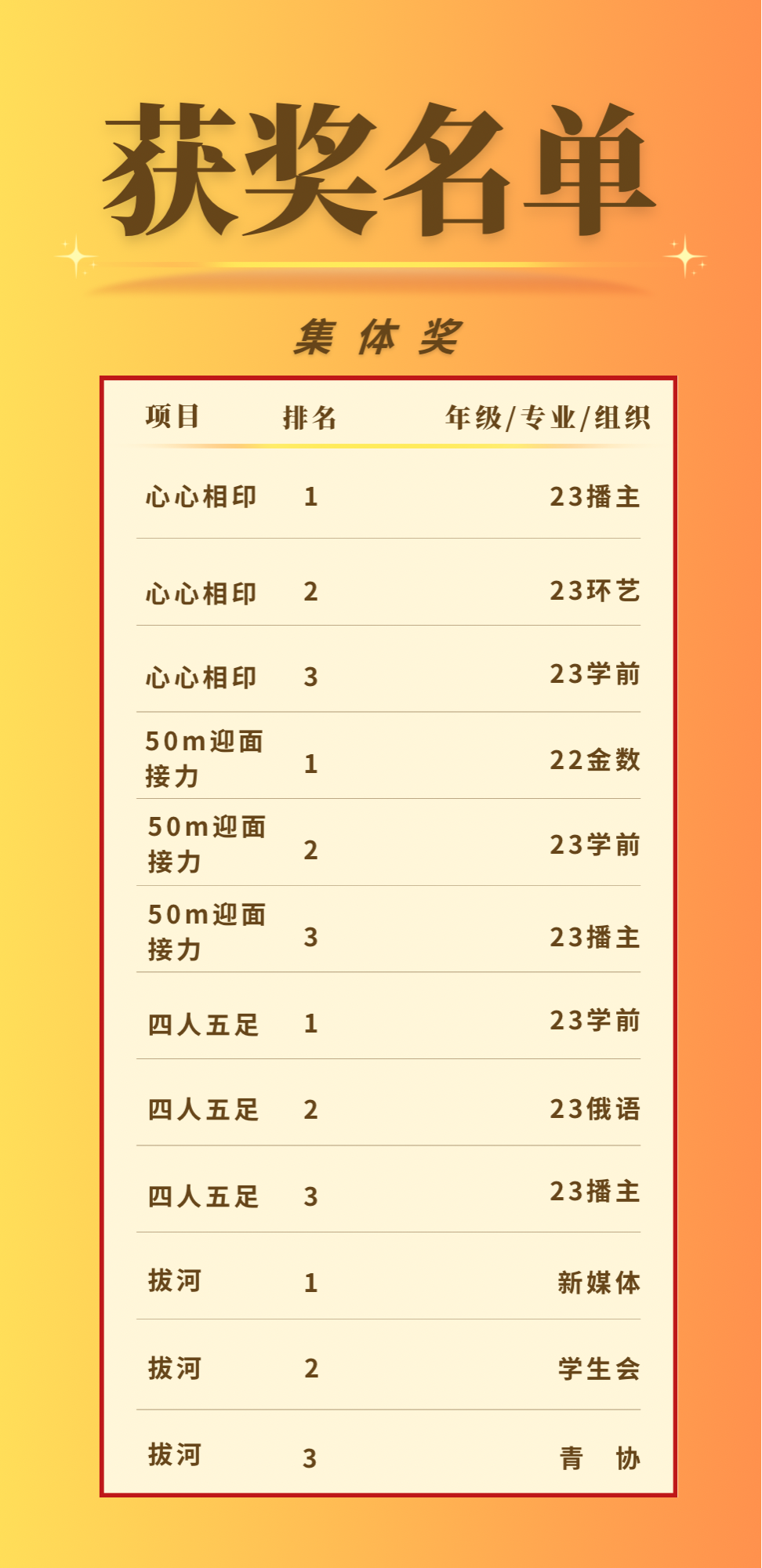 集体项目有:50米迎面接力跑(8男8女)、心心相印(10男10女)、四人五足跑(2男2女)、部门(三大学生组织)拔河。强劲的体魄让青春闪闪发光,运动的魄力让身上熠熠生辉。