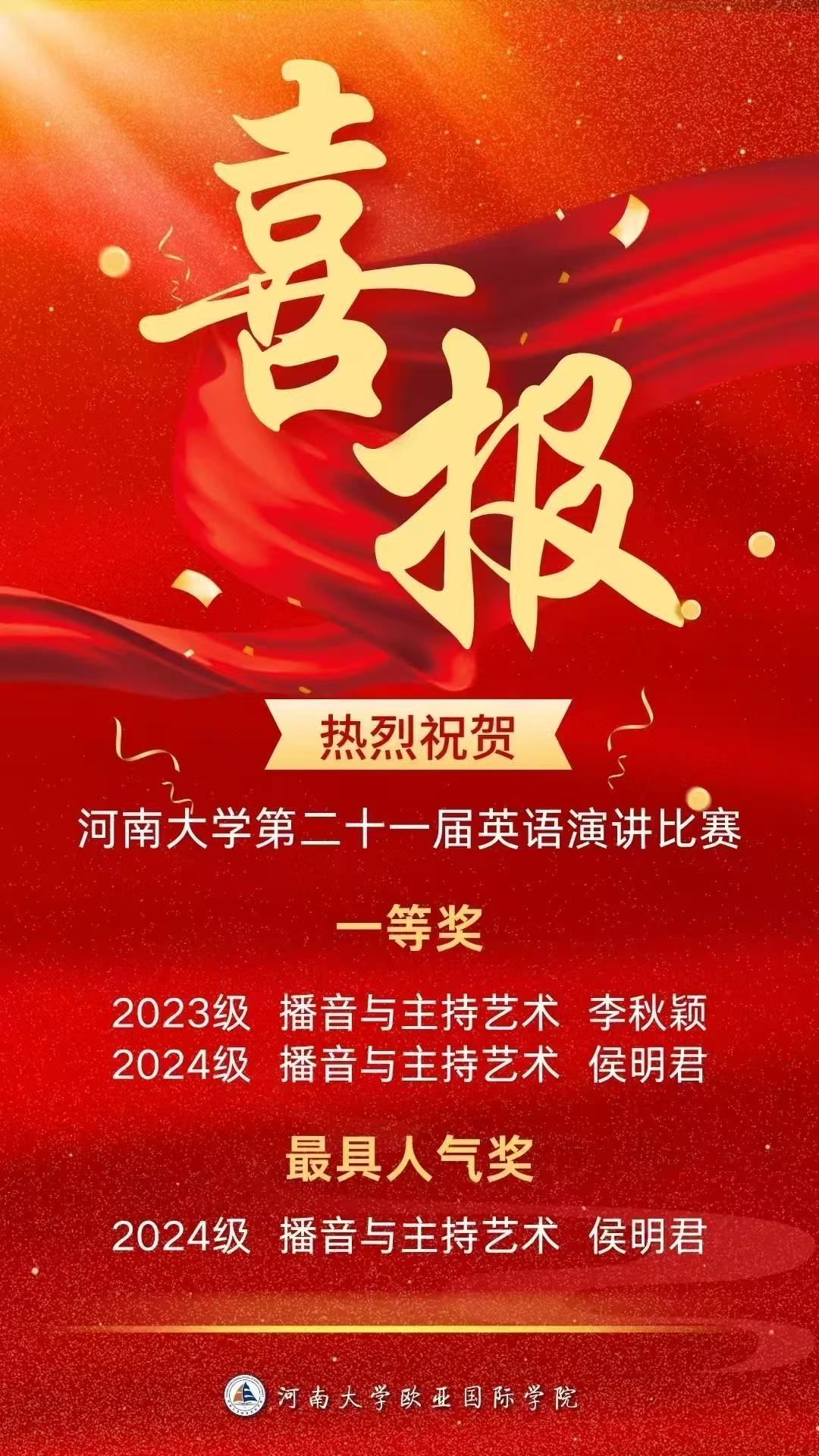 5月29日晚,萝莉岛app 第二十一届英语演讲比赛总决赛落下帷幕。萝莉岛app2023级播音与主持艺术专业李秋颖、2024级播音与主持艺术专业侯明君在比赛中表现出色,双双获得一等奖,侯明君同学还获得了“最具人气奖”。