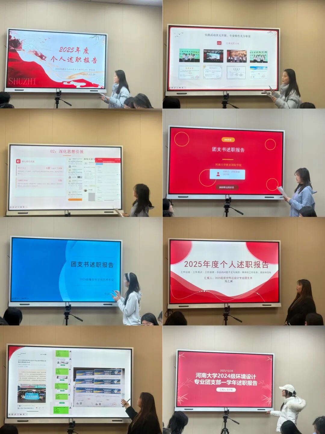 本次述职大会严格遵循“实事求是、客观公正”的原则,采用“现场述职+集中评议”的形式展开。各专业团支书依次上台,对照《团支部述职评议考核标准》,围绕思想引领、组织建设、团日活动、团员发展、学风建设、志愿服务、社会实践和宣传创新等多个方面,结合支部实际,用具体数据、生动案例、详实图文以及亮眼的获奖证书,全面梳理本学期的工作内容。