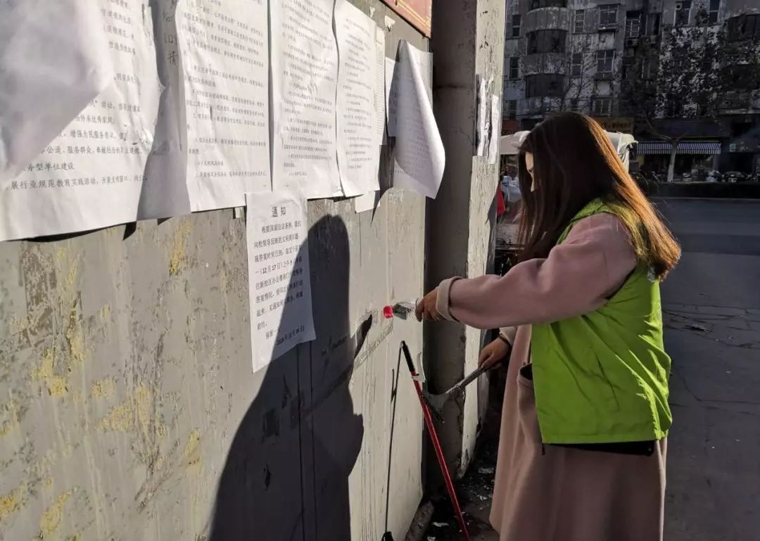活动开始前,社区负责人向志愿者们讲解社区帮扶内容为清理楼道小广告并发放清理工具。随后,志愿者们分为三人一组开始了楼道清理工作。