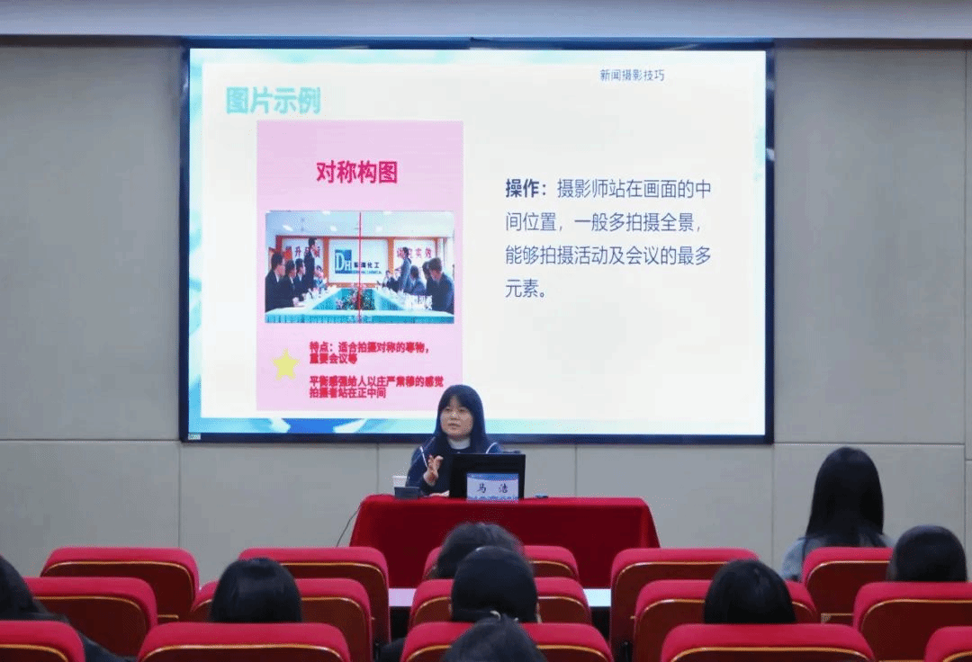 马洁围绕“新闻的涵义”“消息的写作”和“新闻摄影技巧”三方面进行详细讲解。她强调,写好新闻要遵循及时性、真实性、客观性和简洁性。她希望同学们通过新闻写作提升逻辑思维与表达能力,注重标题的吸引力、导语的概括性和主体内容的逻辑性,在实践中不断提升综合素质与专业水平,从中收获成就感与价值感。随后,她就快速出稿的技巧和新闻写作的细节与参会人员展开交流,并以学校优秀新闻作品为例,讲解摄影构图、光线运用和拍摄角度的基本技巧,深入分析了新闻图片在稿件中的运用方法。