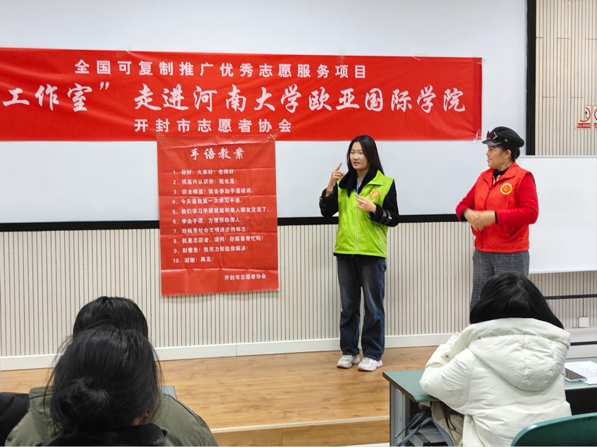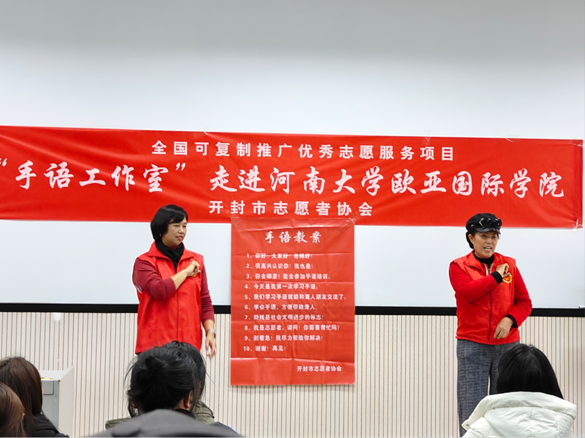 活动的伊始,姚子熠首先介绍了来自开封市志愿者协会手语工作室的鲍冰、马仁梅、辜谢军、陈伟四位老师。