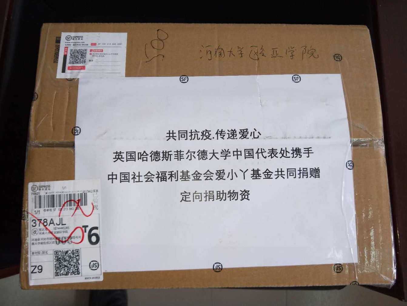 英国哈德斯菲尔德大学于2018年开始与我校开展合作办学,目前与我校联合举办有金融数学和土木工程2个中外合作办学项目。在得知我国目前新冠肺炎疫情后,哈德斯菲尔德大学对我校防疫工作十分关心,认为中英两校应携手共度难关,并表示愿意向我校捐助一批医用口罩。
