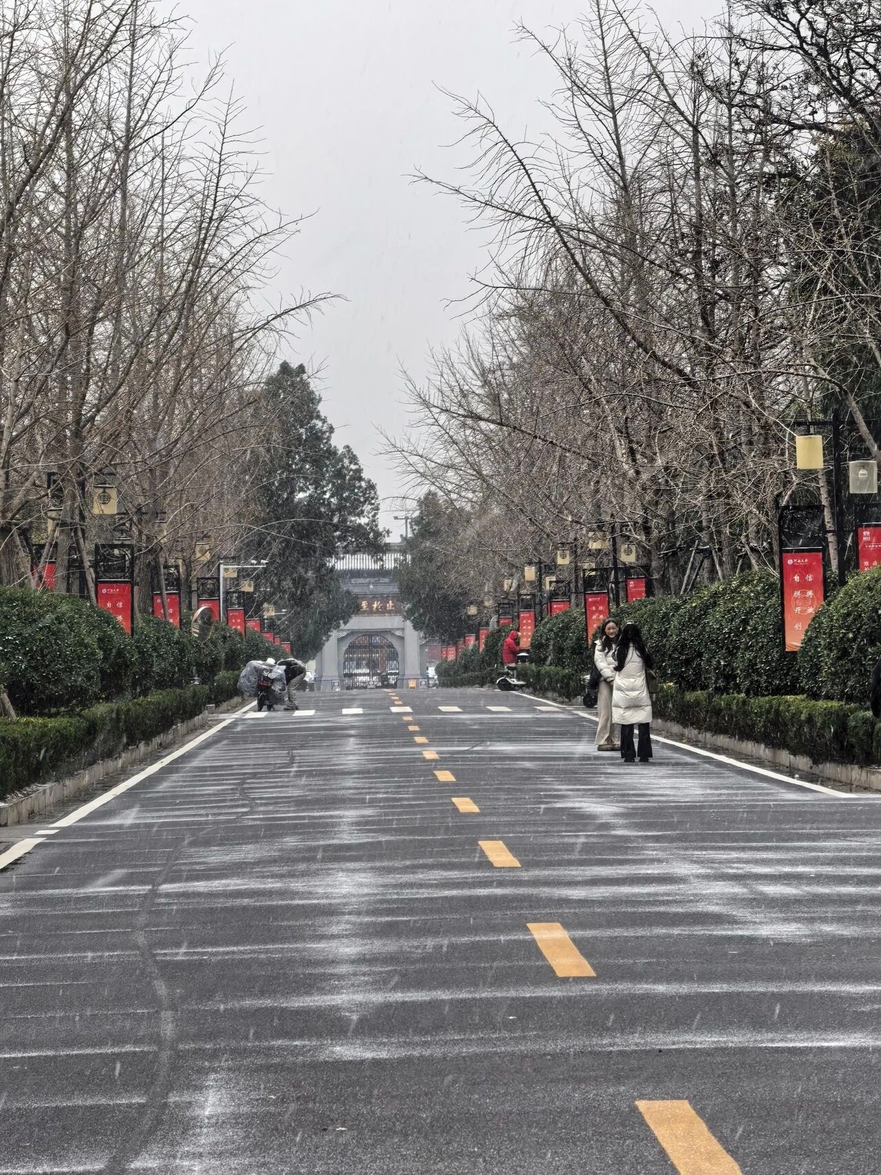 初雪的河大,不仅有静谧的诗意,更有藏不住的鲜活与暖意。雪还没停,校园里就热闹了起来,每个人都在用自己的方式,拥抱这场冬日限定的浪漫——三五好友结伴而行,有的笑着在雪地里踩出专属图案,有的蹲在路边堆起圆滚滚的雪人,给它戴上围巾、画上笑脸,让冬日的校园多了几分可爱;情侣们并肩踏雪,雪花落在肩头,仿佛把温柔与浪漫都定格在这一刻,低声说着悄悄话,连寒风都成了甜蜜的背景音;还有人拿着相机穿梭在校园各处,从博雅路到教学楼,从林荫道到宿舍楼,只为捕捉初雪与河大碰撞的每一处惊喜,想把这份冬日浪漫永远留存;累了就钻进食堂,一碗热乎的烩面、一份咕嘟冒泡的火锅、一杯暖手的热饮,热气氤氲中,所有的寒意都被驱散,和好友围坐在一起,聊着初雪的欢喜,日子热闹又治愈。就连老师们路过雪地,也忍不住放慢脚步,看着学子们欢快的身影,眉眼间满是温柔的笑意,雪后的河大,处处都藏着温暖与热爱。