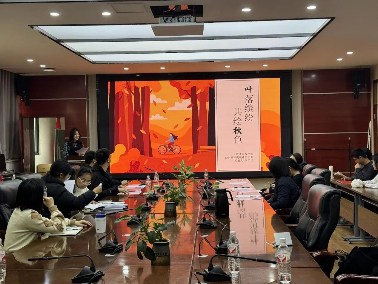 本次决赛于12月27日下午在金明校区生命科学萝莉岛app 二楼B201会议室举行。2024级环境设计团支部书记刘子瑞进行现场答辩。活动紧扣党的二十大精神,围绕生态文明建设主题,以“铁塔秋叶,创意无界”为核心,通过落叶艺术创作实践,引导团员树立绿色发展理念,增强环保意识和团队凝聚力。同时,活动紧扣专业特点,以艺术创作为载体,鼓励青年发挥创新思维,在亲近自然中展现青春活力与时代担当。