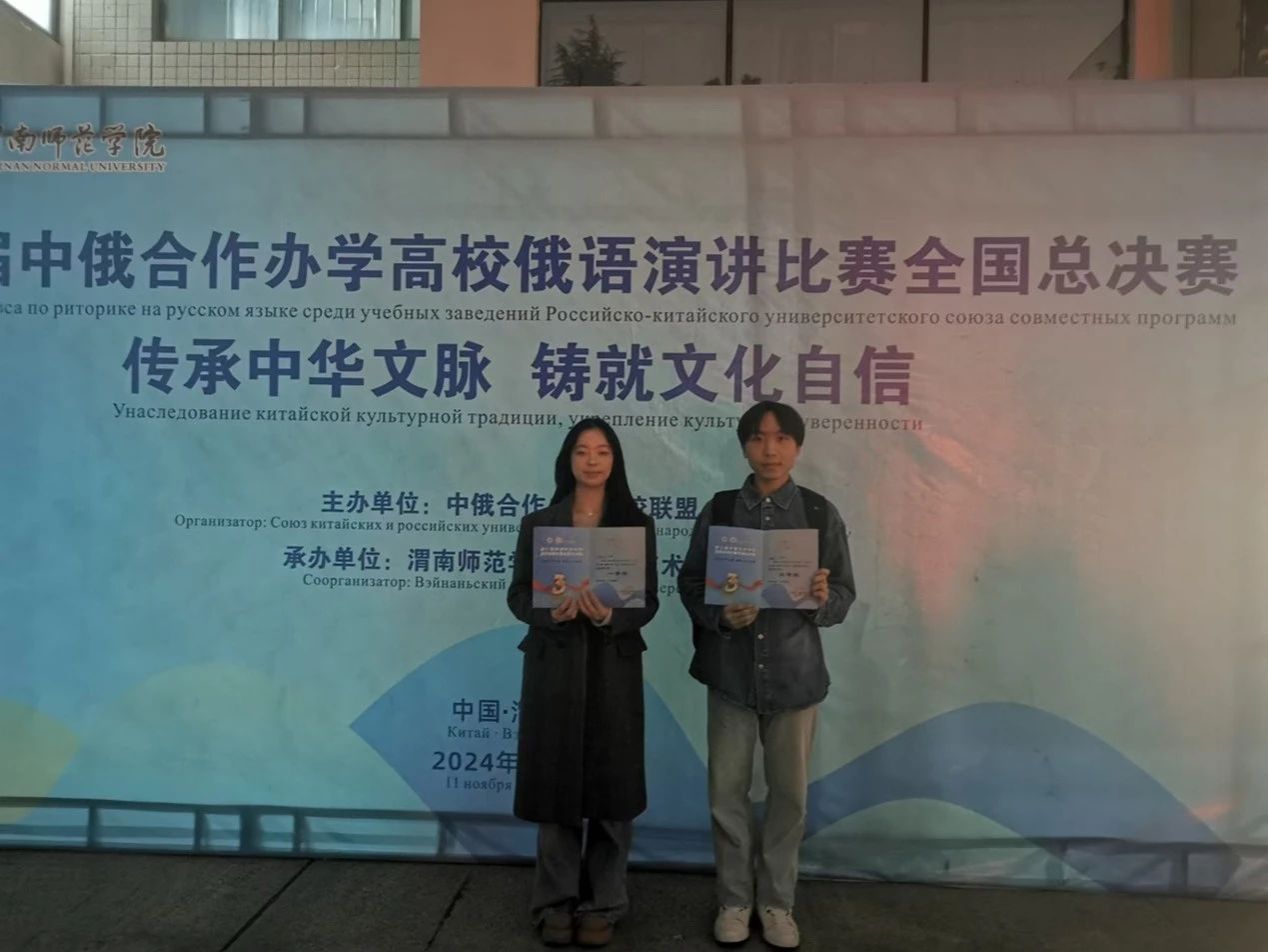 11月11日,由中俄合作办学高校联盟主办的第三届中俄合作办学高校俄语演讲比赛全国总决赛在渭南师范萝莉岛app 举行。比赛吸引了全国近30所高校共计80余名学生参加。我校萝莉岛app 俄语教师王宇乔带队参赛,经过激烈角逐,萝莉岛app 2022级俄语专业陈秋利同学获得高年级组一等奖、2023级视觉传达设计专业李晨果同学获得低年级组三等奖。