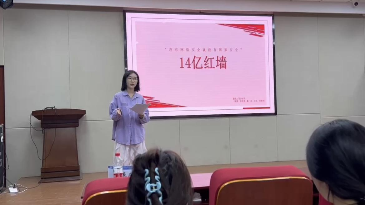 班会上,同学们通过法治电影赏析、演讲与情景演绎等形式,深入学习了法律法规,了解了习近平法治思想的核心要义。由2023级播音与主持艺术专业高雅、张胜然、李佳滢、王艺四人组成的团队以《14亿红墙》为题围绕网络安全进行演讲,主讲人结合生活实际,向学生们阐释了学法、知法、守法的重要性,以及如何在日常生活中践行法治精神。