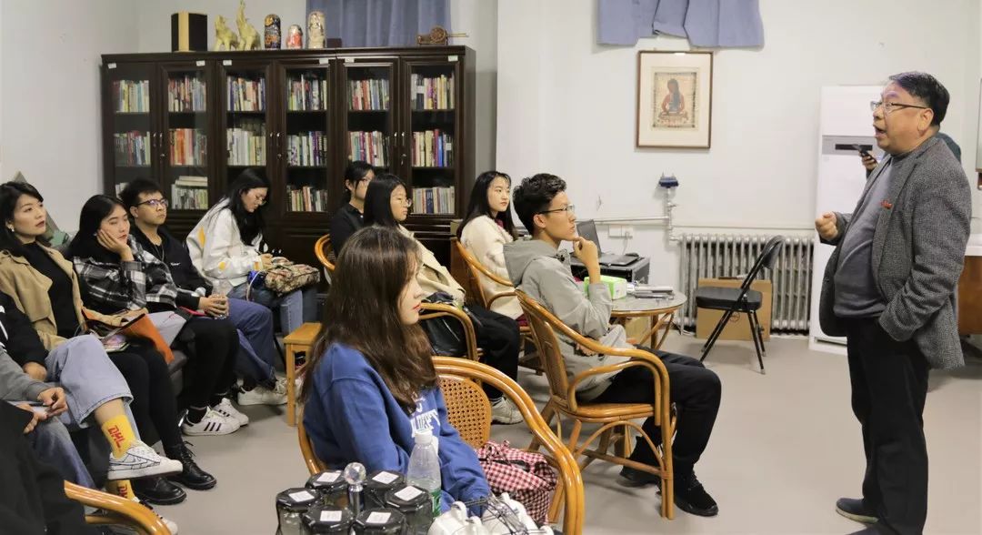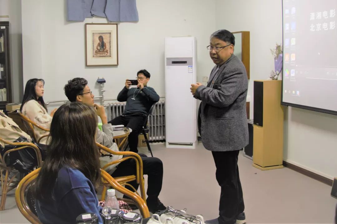 党委书记李卫国与学生代表探讨电影、交流感受。