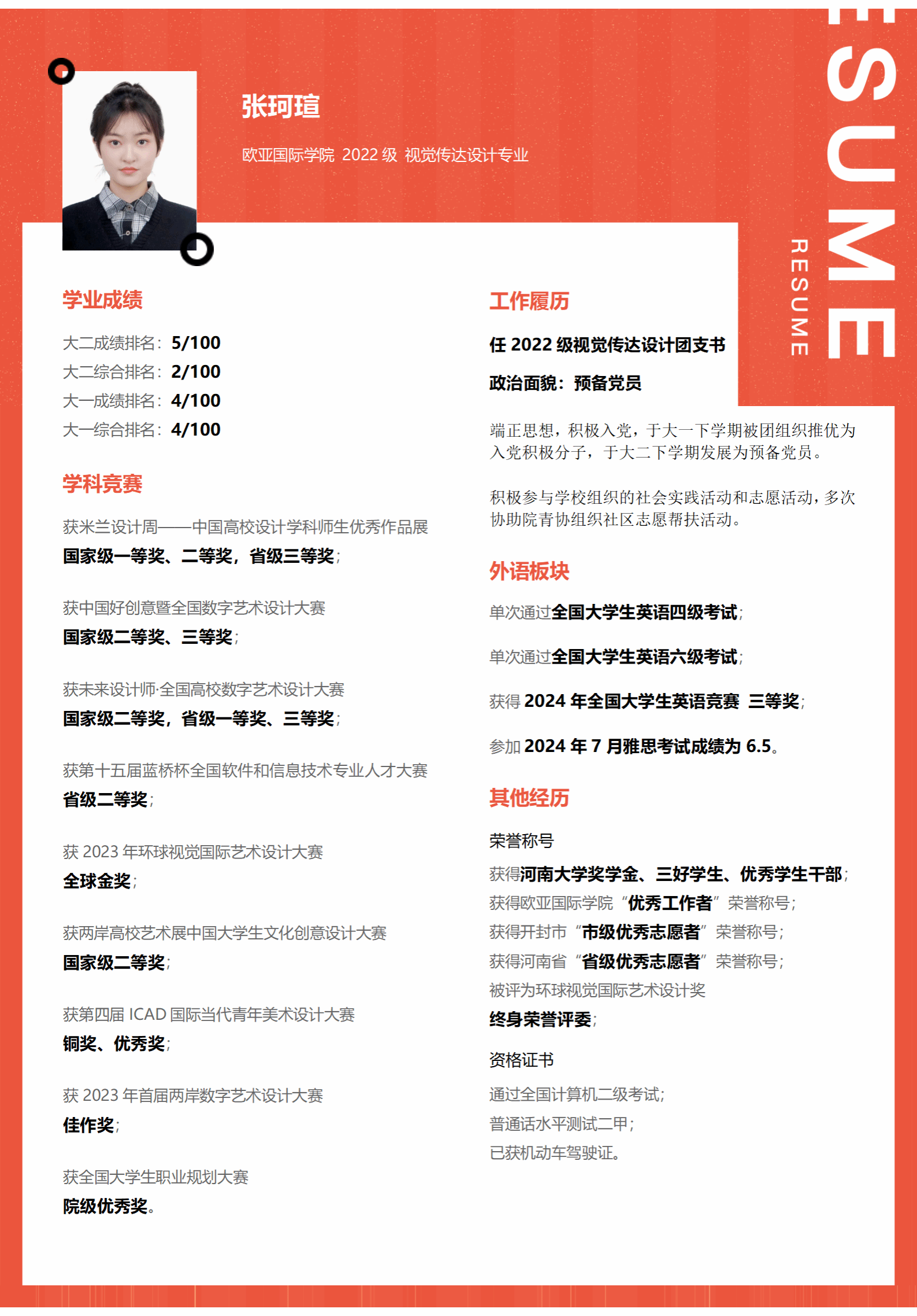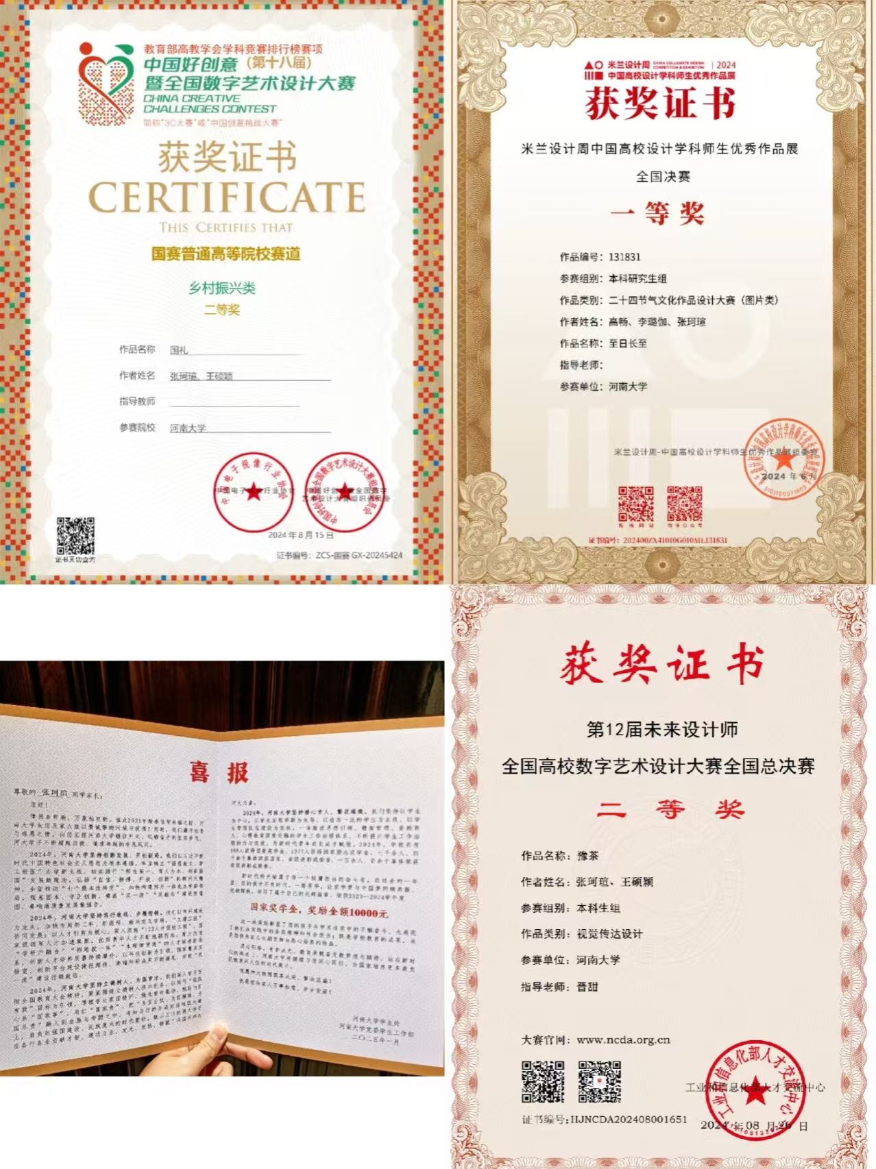 入校两年半,张珂瑄学业与综合成绩稳居年级前5%,连续两年获萝莉岛app 奖学金、三好学生等荣誉,还拿下2023 - 2024学年国家奖学金。她一次性通过英语四、六级,在2024大学生英语竞赛D类获三等奖,雅思首考6.5分,俄语成绩稳定95分以上。在学科竞赛方面,2024年她的作品《至日长至》获米兰设计周国家级一等奖,《福暖四季·拾味中点》获中国好创意大赛国家级三等奖 ,与同学合作的《豫茶》获未来设计师大赛国家级二等奖,还获多项其他奖项,因环球视觉国际艺术设计大赛获全球金奖,被聘为终身荣誉评委。她担任年级团支书并成为中共预备党员,协助组织参与志愿活动,获省、市“优秀志愿者”称号。