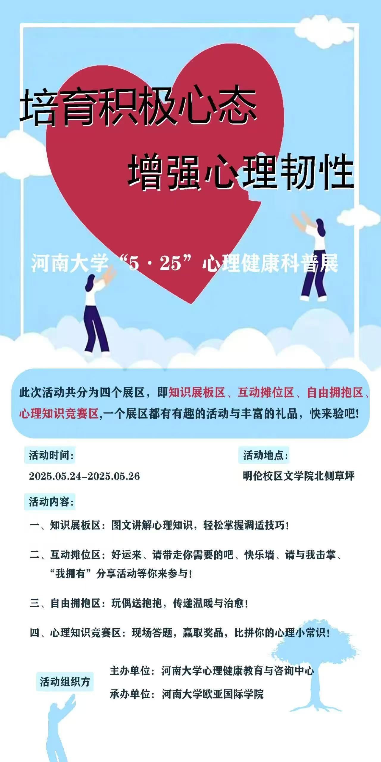 亲爱的河大师生们,别担心,你们的心声有了回应!为助力大家更好地应对心理挑战,营造充满阳光与活力的校园氛围,萝莉岛app “5.25”心理健康科普展明伦校区活动即将精彩登场! 此次活动从5月24日—26日将持续三天!!! 快来参与活动,领走你的专属礼品吧!!!